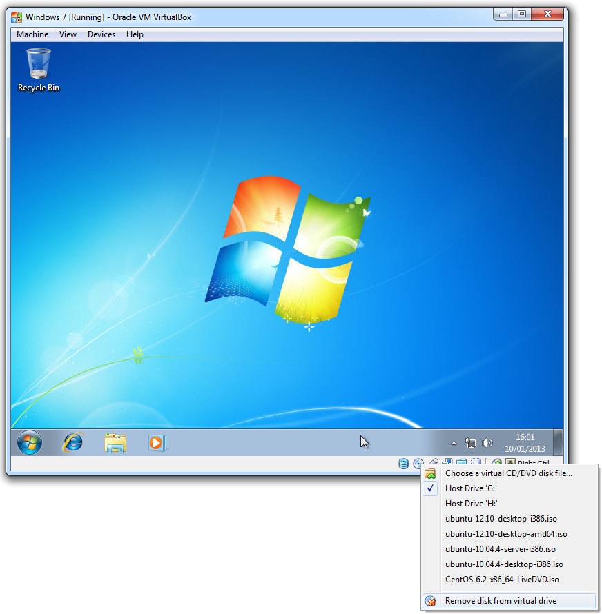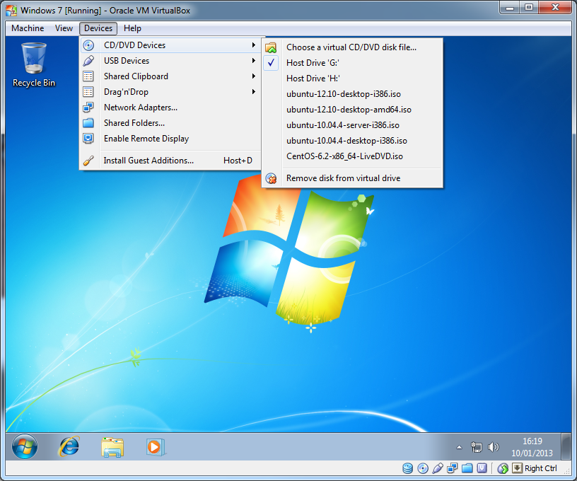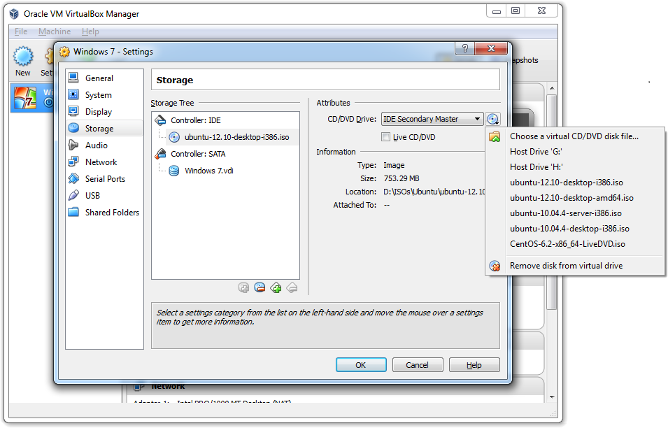 • Right click: 'CD icon' --> Choose a virtual CD/DVD disk file.../Host Drive