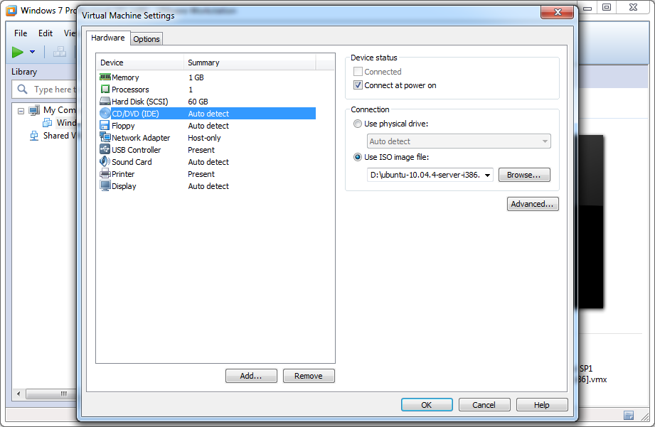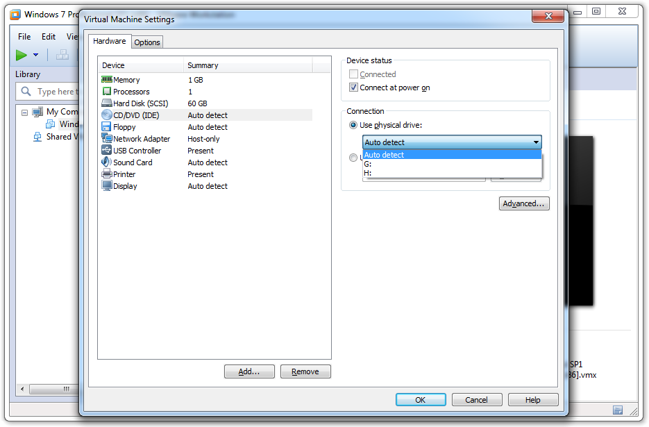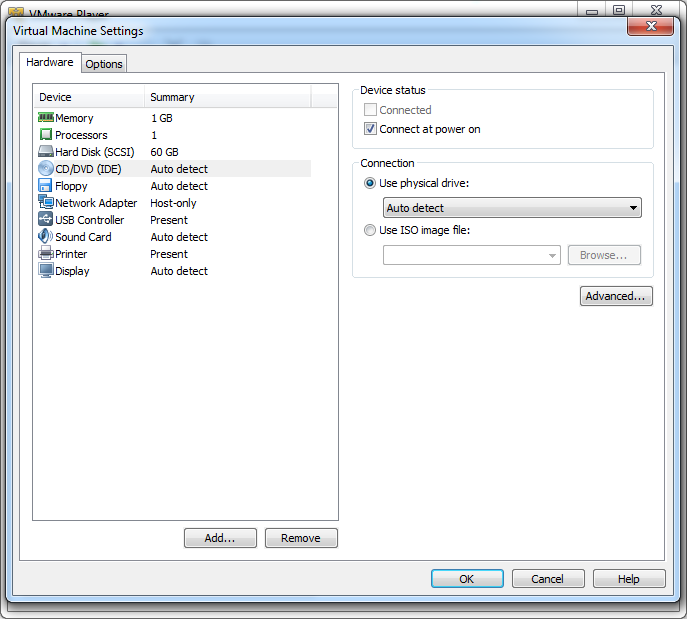 2. Hardware --> CD/DVD (IDE) --> Choose physical drive or Use ISO image file