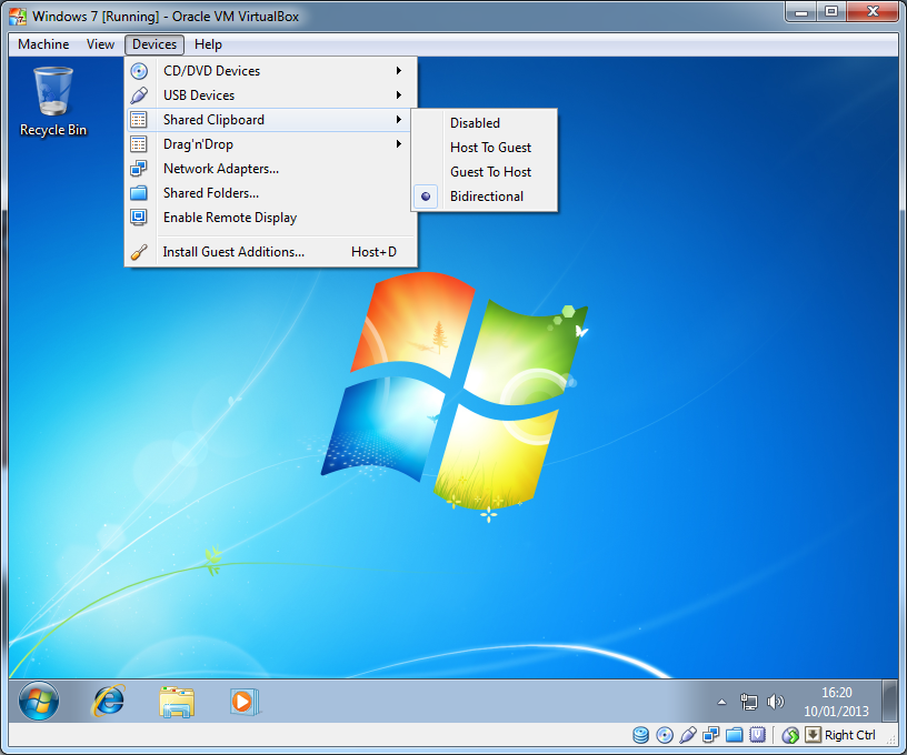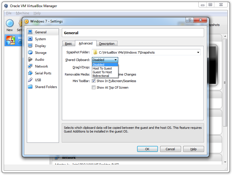 2. General --> Advanced --> Shared Clipboard: 'Bidirectional --> Ok