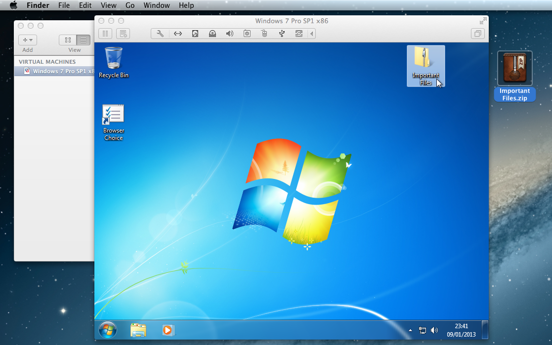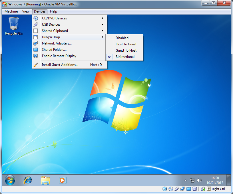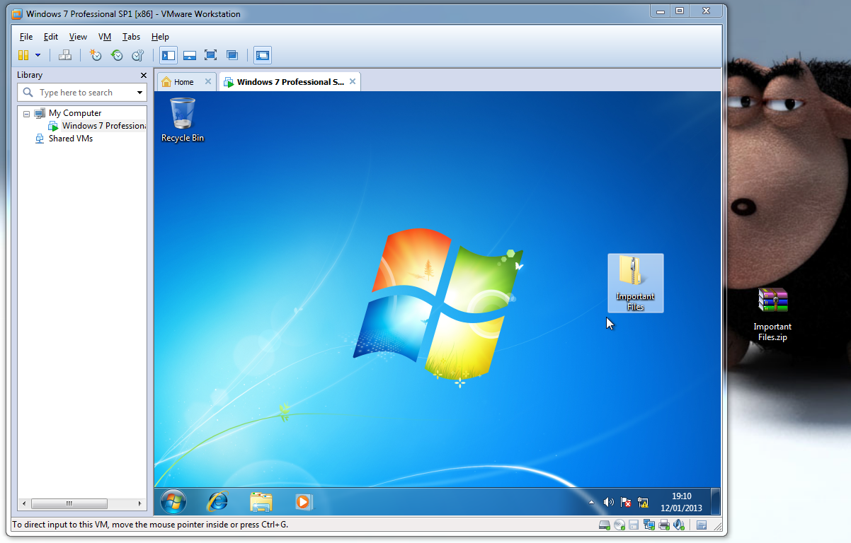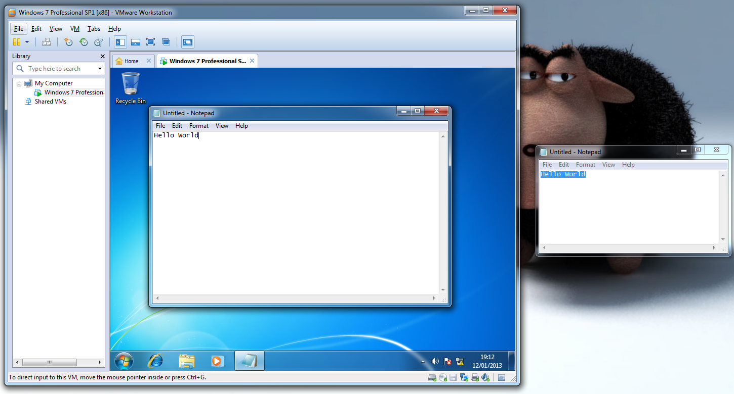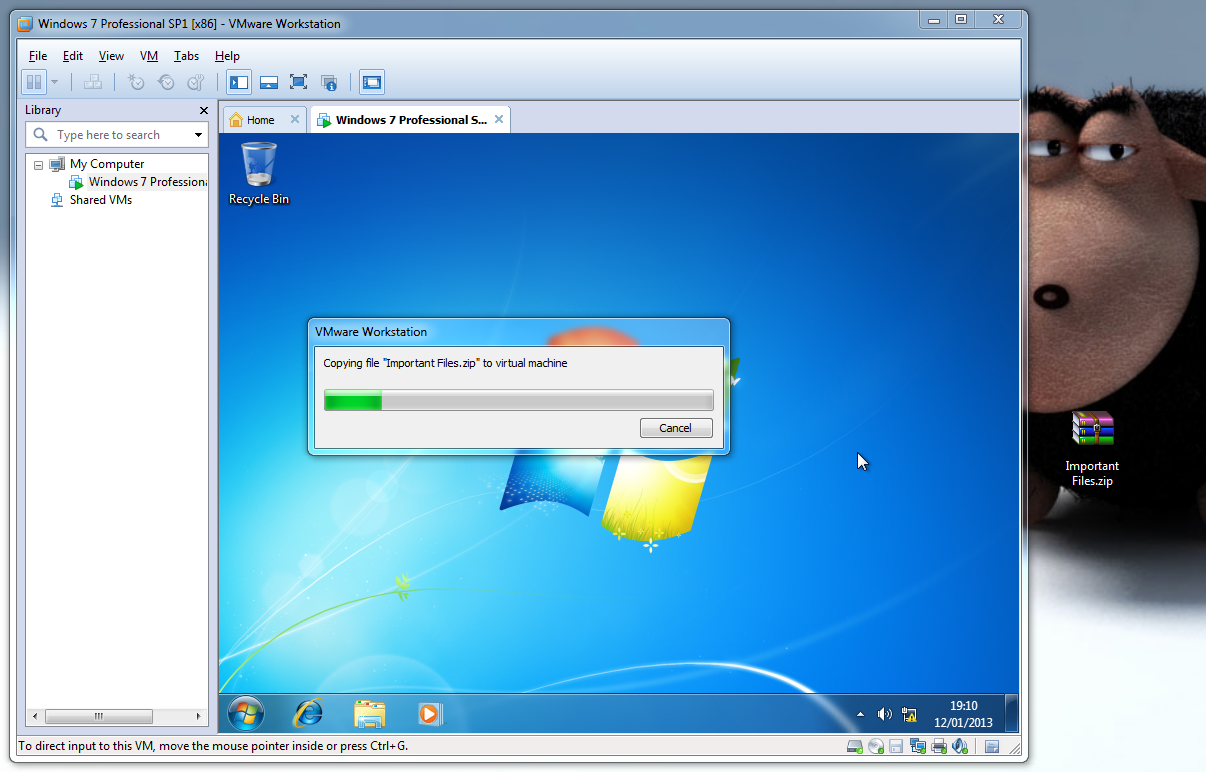 3. Select a file(s)/folder(s) --> Click & hold down --> drag into/out of the virtual machine --> Release mouse