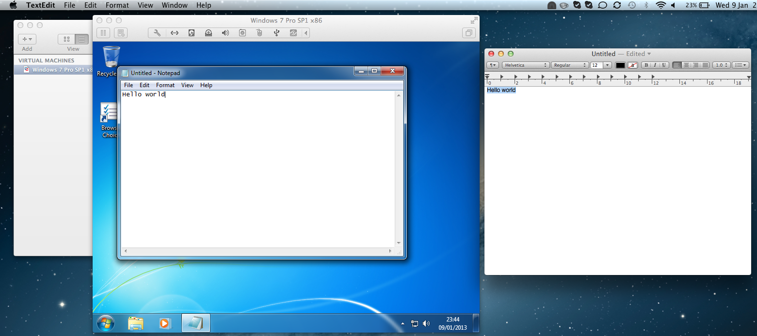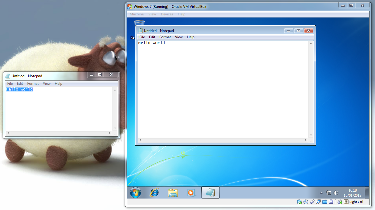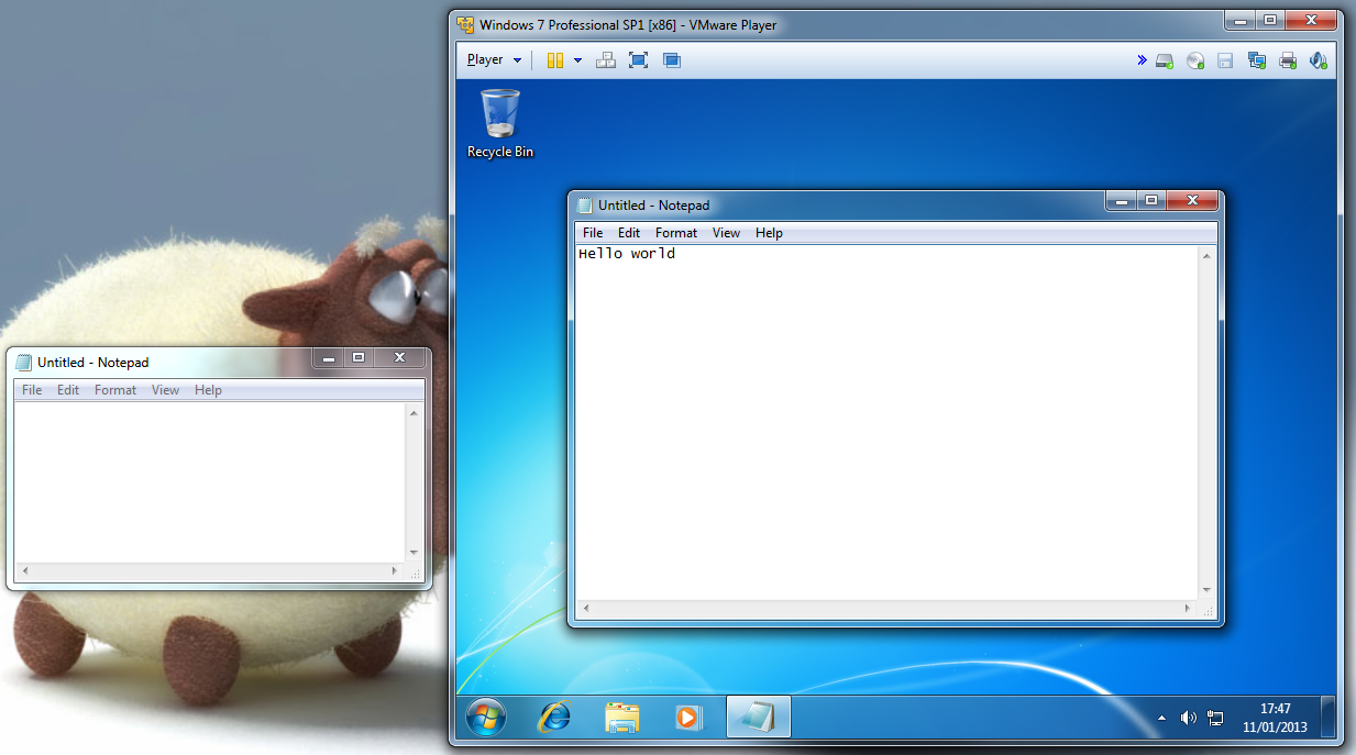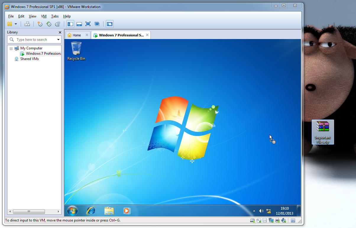 3. Select a file(s)/folder(s) --> Click & hold down --> drag into/out of the virtual machine --> Release mouse