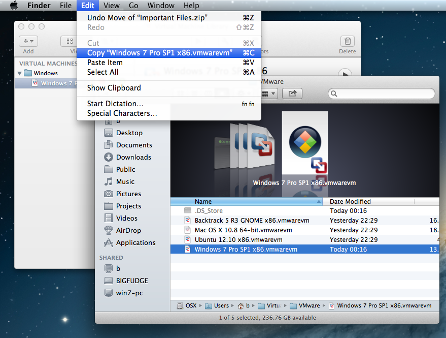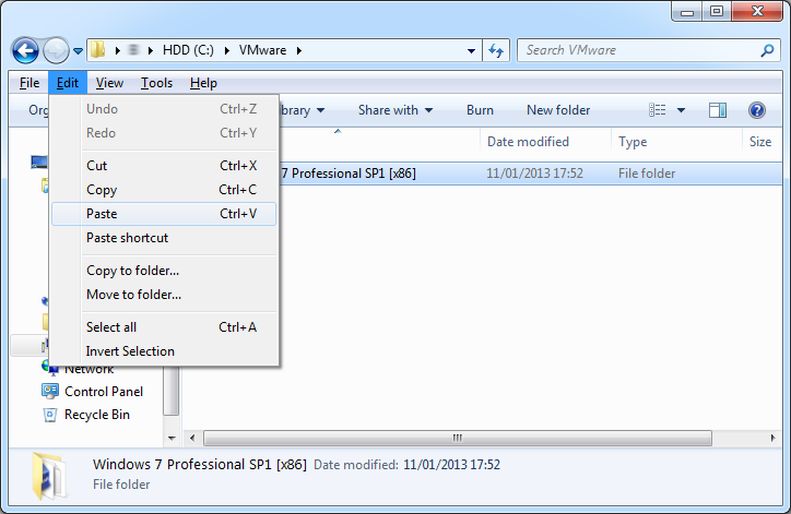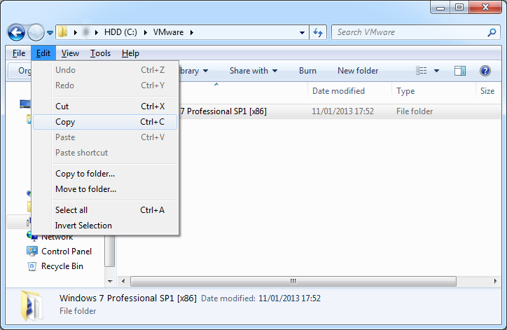 3. Select: '<Machine name>.vmwarev' --> Edit-> Copy <Machine name>.vmwarevm