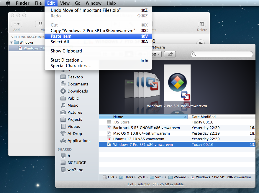 4. Edit --> <Machine name>.vmwarevm --> Paste Item