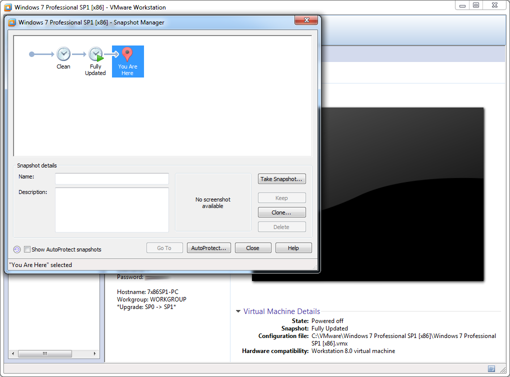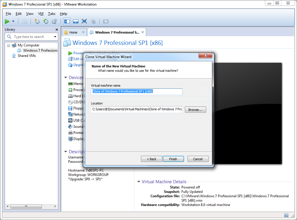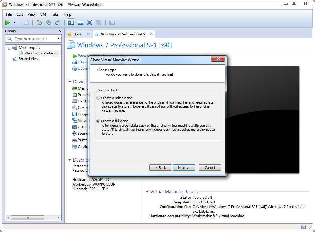 3. Next --> Select: 'The current state in the virtual machine' --> 'Create a full clone' --> Name & Location -->