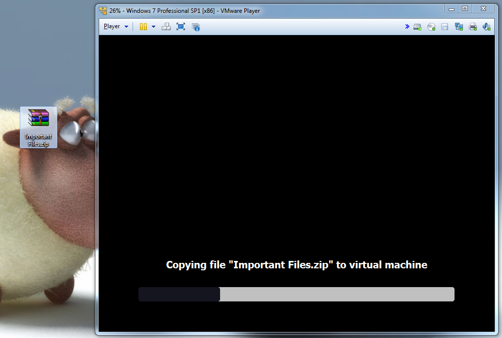 • Select a file(s)/folder(s) --> Click & hold down --> drag into/out of the virtual machine --> Release mouse