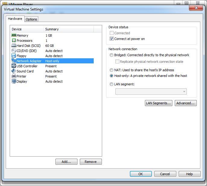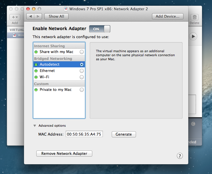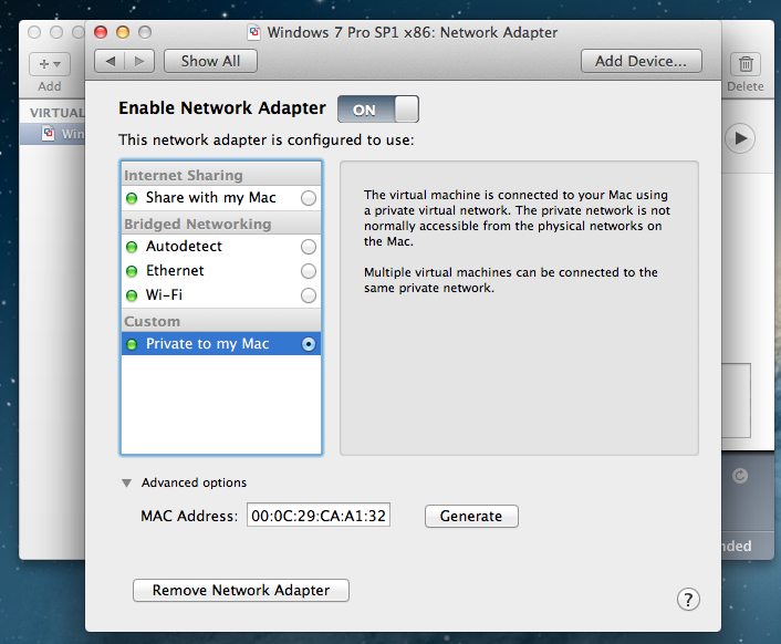 4. Enable: 'Enable Network Adapter' --> Select network mode