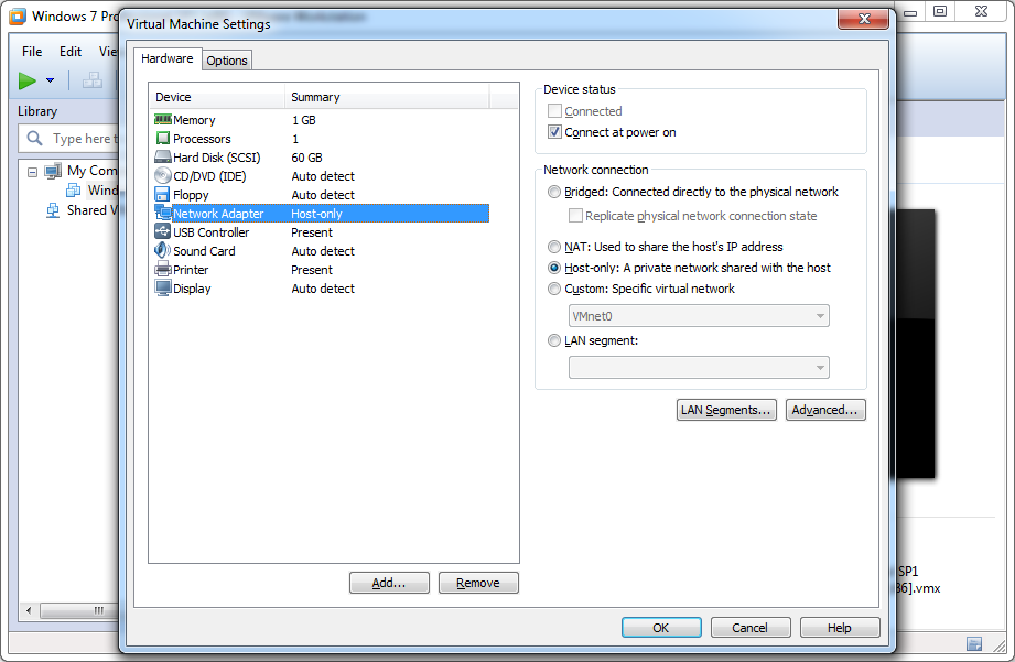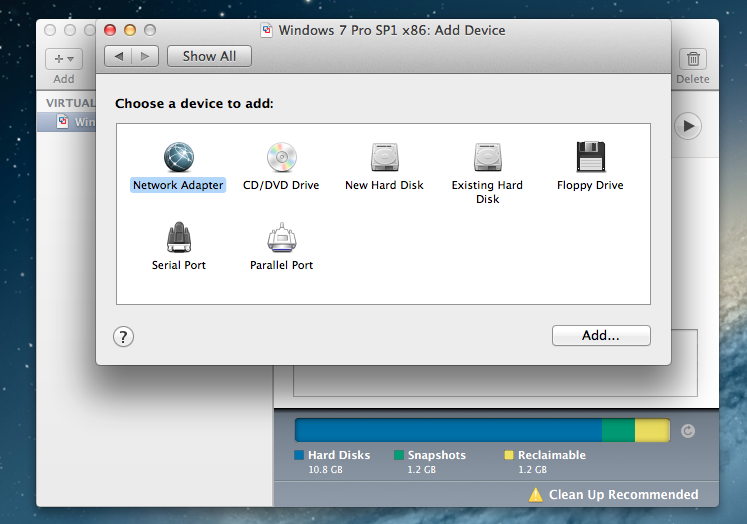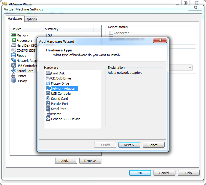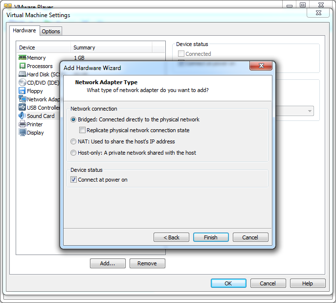 3. Add --> 'Yes' to UAC if its enabled --> Network Adapter --> Next --> Select network mode --> Finish --> Ok