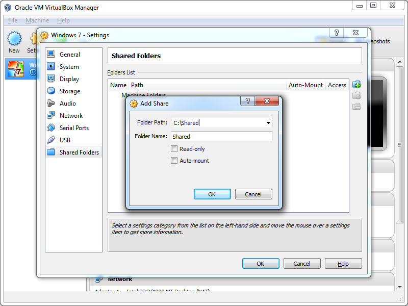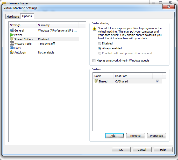 2. Options --> Shared Folders --> Enable: 'Always enabled' --> Add --> Next